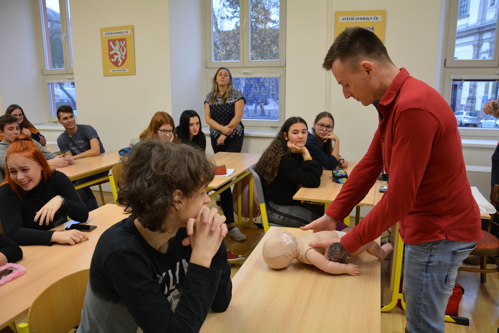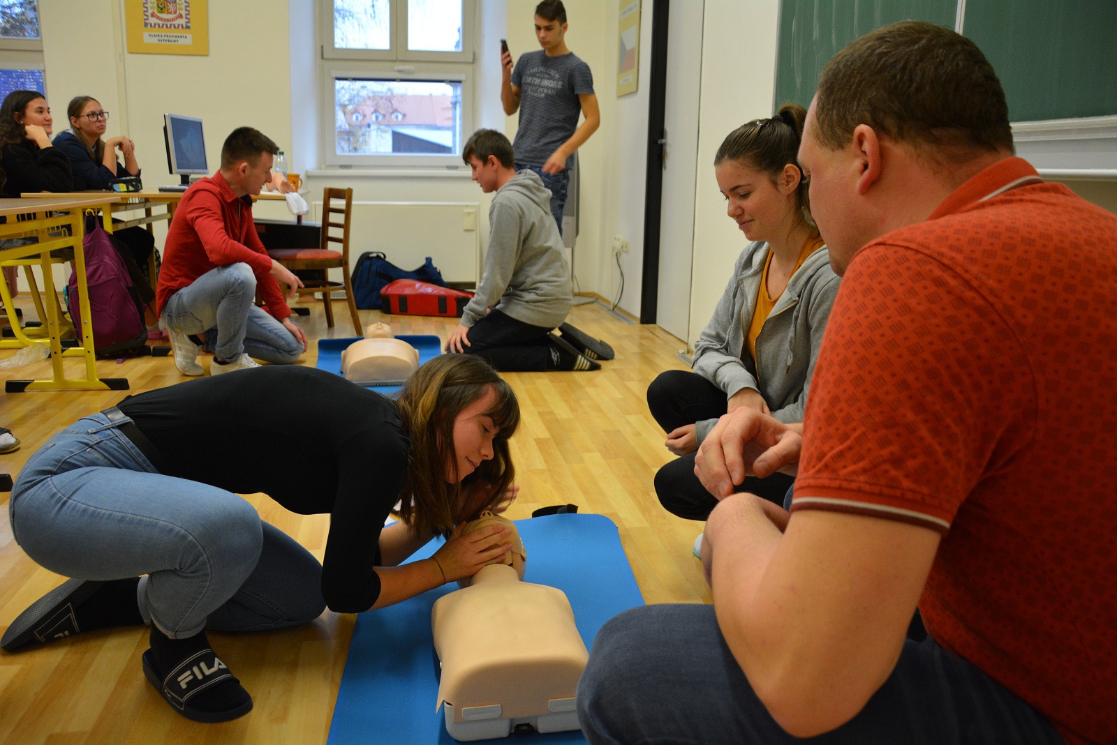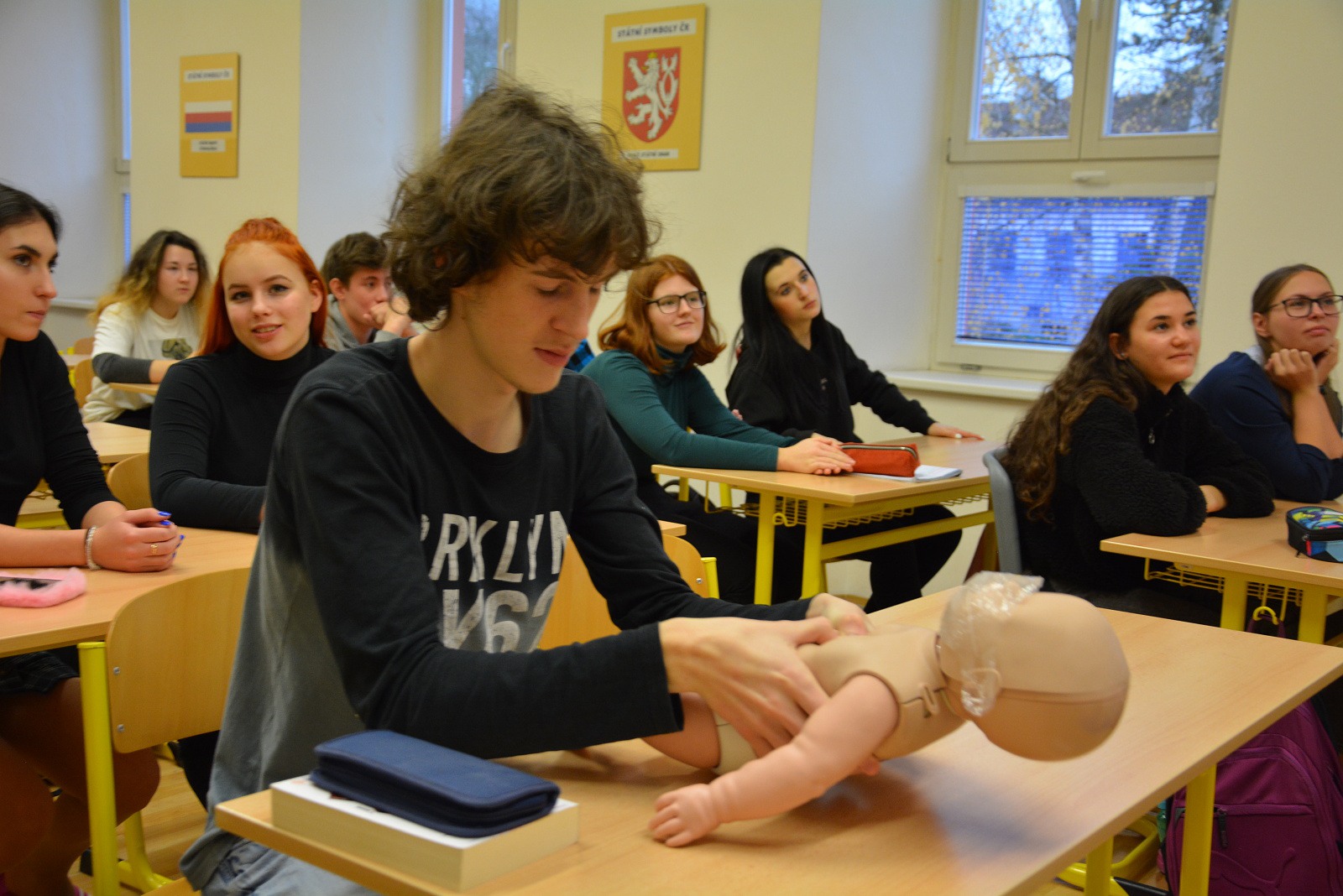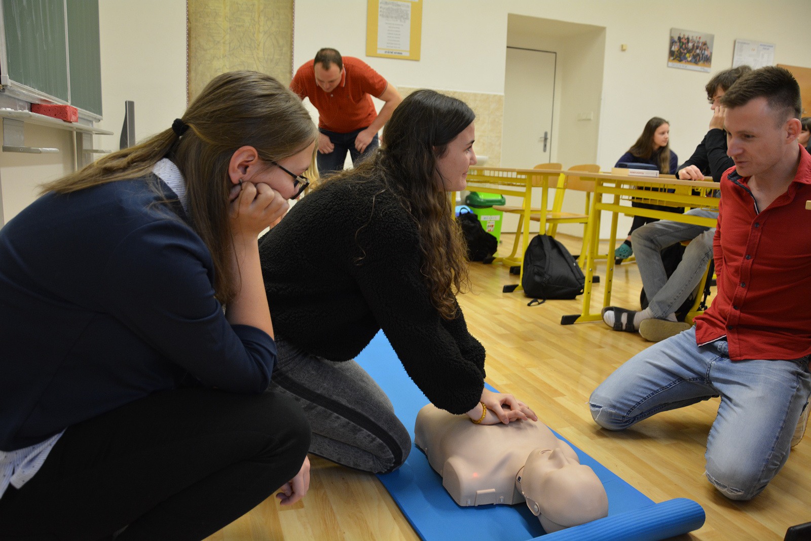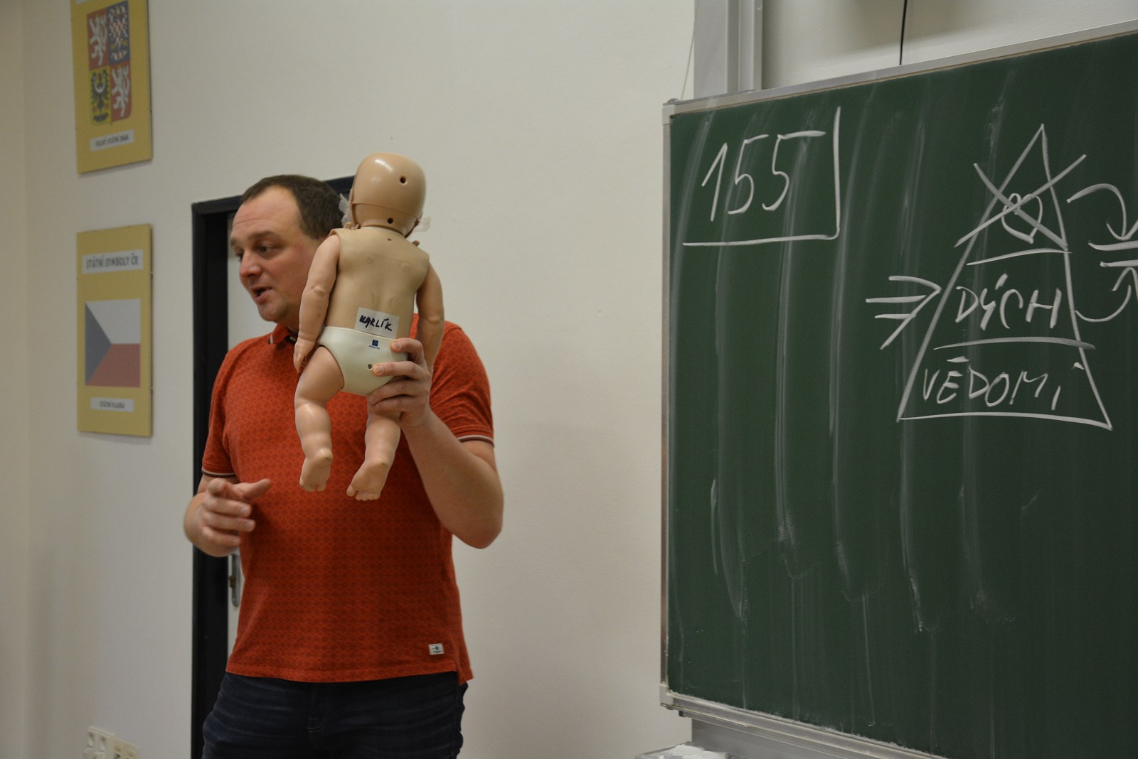 Nejdůležitější pro žáky ovšem byla možnost praktického vyzkoušení srdeční masáže na cvičných figurínách – na figuríně dospělého člověka, většího dítěte a kojence „Karlíka“.