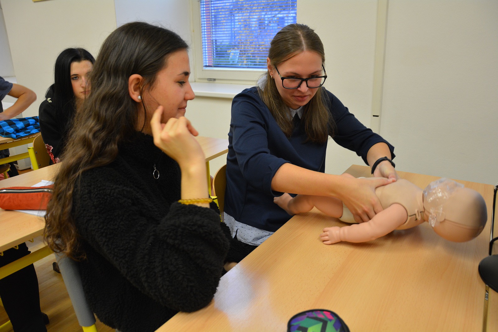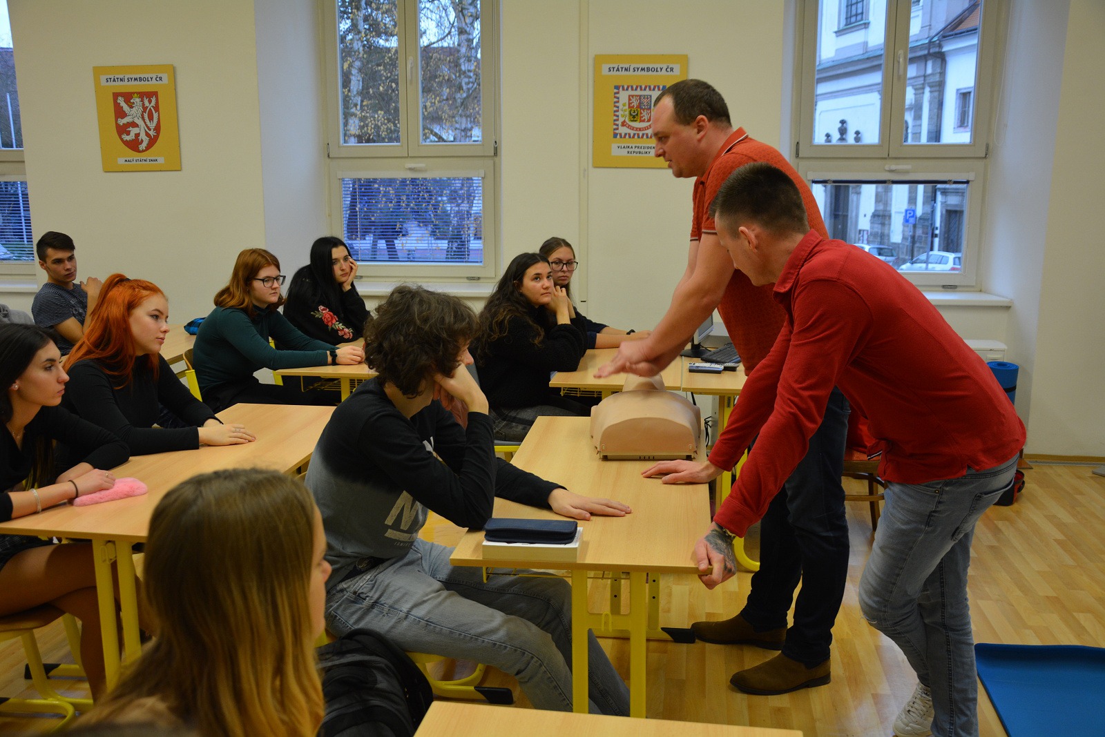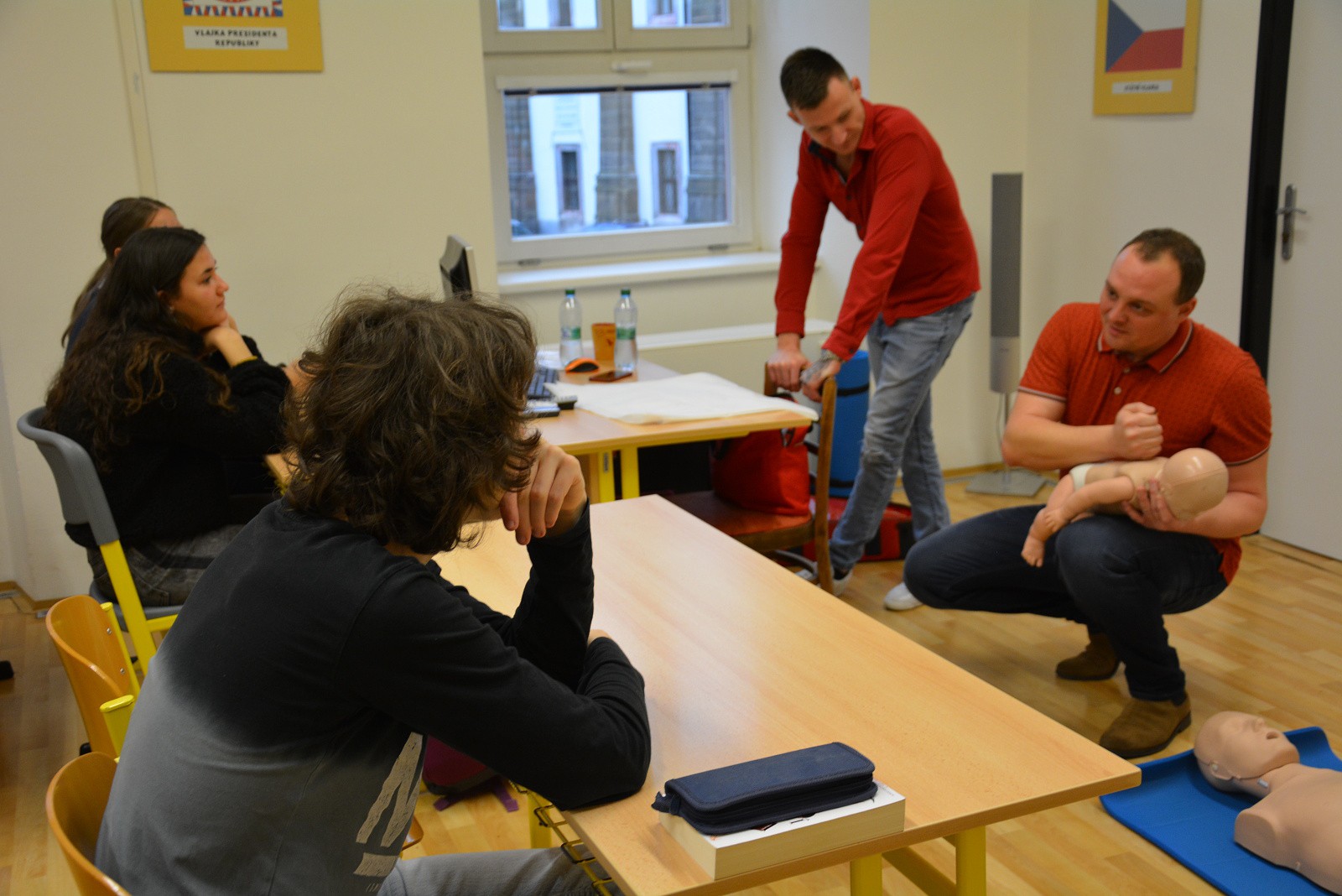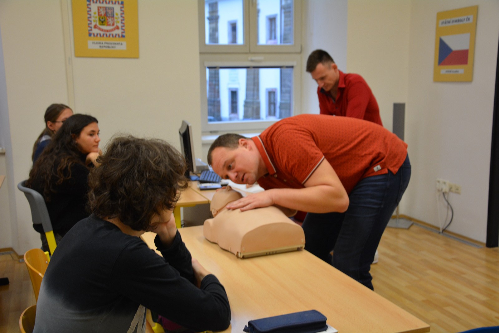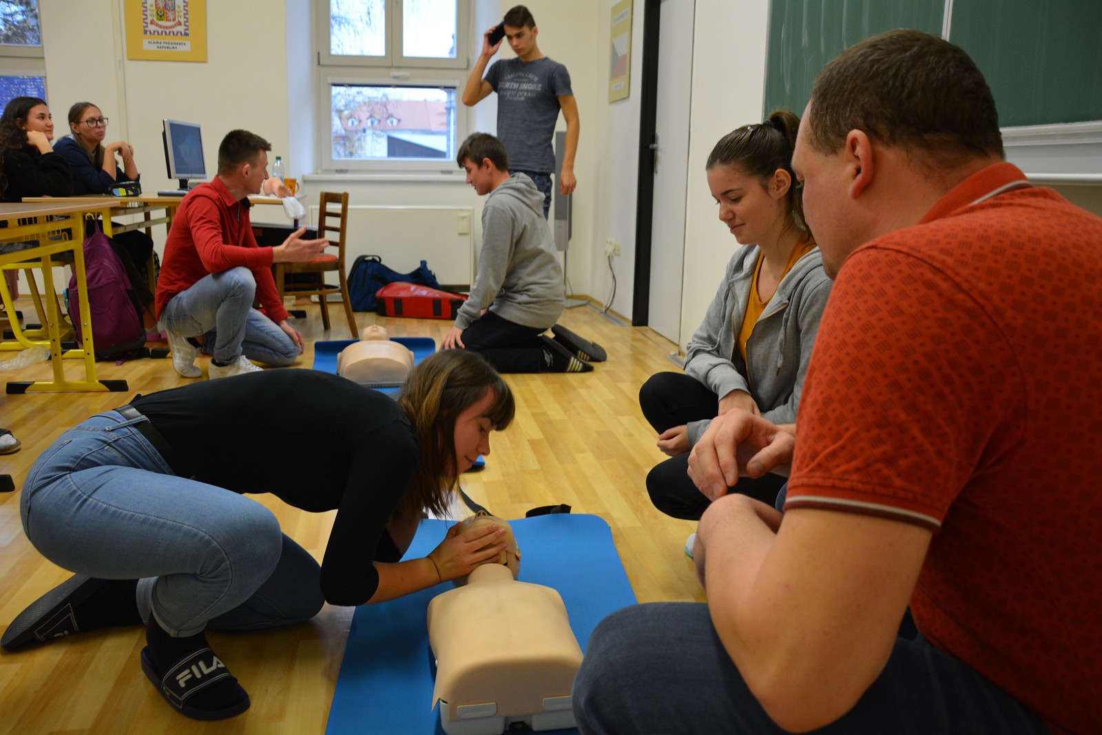 Nejdůležitější pro žáky ovšem byla možnost praktického vyzkoušení srdeční masáže na cvičných figurínách – na figuríně dospělého člověka, většího dítěte a kojence „Karlíka“.