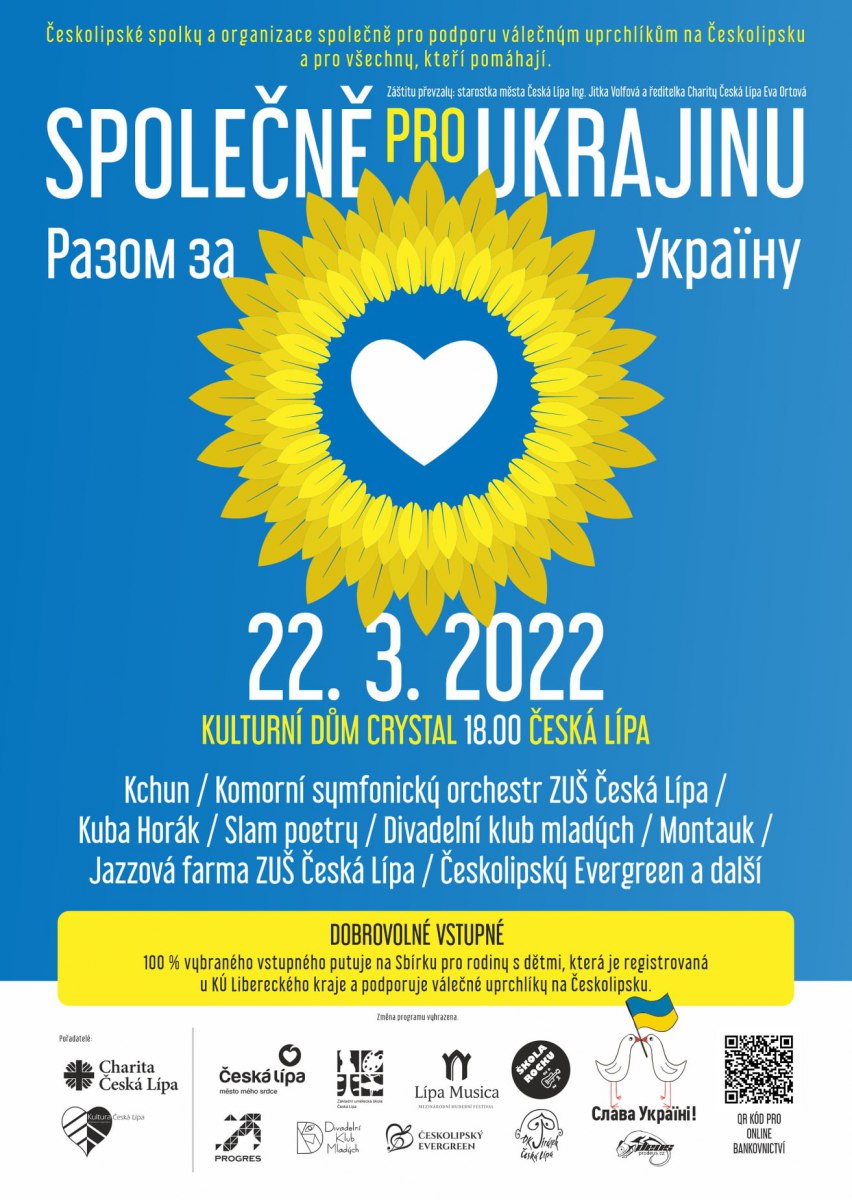 V úterý 22.3.2022 se ve večerních hodinách uskutečnil charitativní koncert Společně pro Ukrajinu. V průběhu slavnostního večera se představili zástupci z různých oblastí českolipského kulturního života – Lípa musica (duo Kchun), Českolipský Evergreen, Komorní symfonický orchestr ZUŠ Česká Lípa, Divadelní klub mladých Česká Lípa, Jazzová farma ZUŠ Česká Lípa a další. Celý projekt zaštiťovala Charita Česká Lípa ve spolupráci s Kulturou Česká Lípa. Výtěžek z dobrovolného vstupného byl věnován na pomoc Ukrajině.