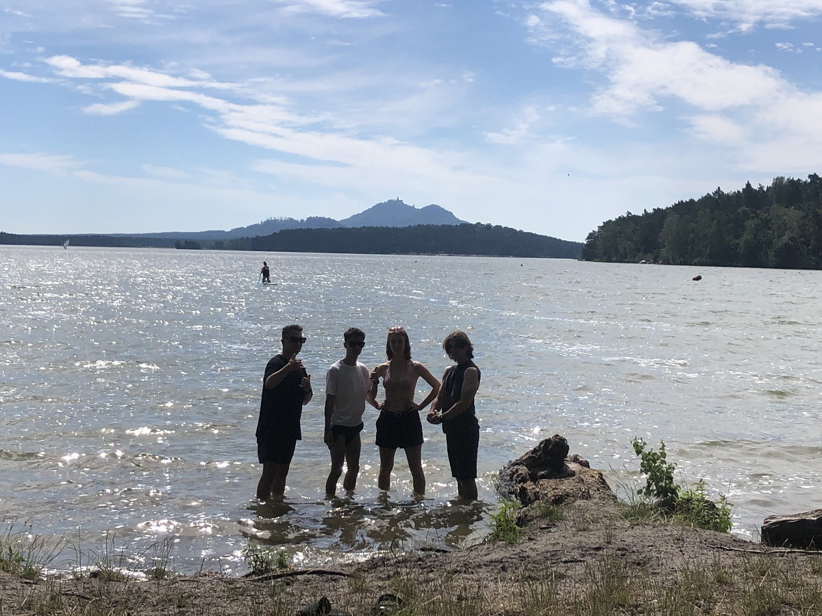 První výlet byl zaměřen na putování po stopách K. H. Máchy. Vlakem do Doks, pěšky kolem jezera, okolo Jarmiliny skály, přes hlavní pláž, občerstvení na molu až k nástupišti ve Starých Splavech, tady všude byl Mácha i my. Snad mu nebylo takové horko jako nám.