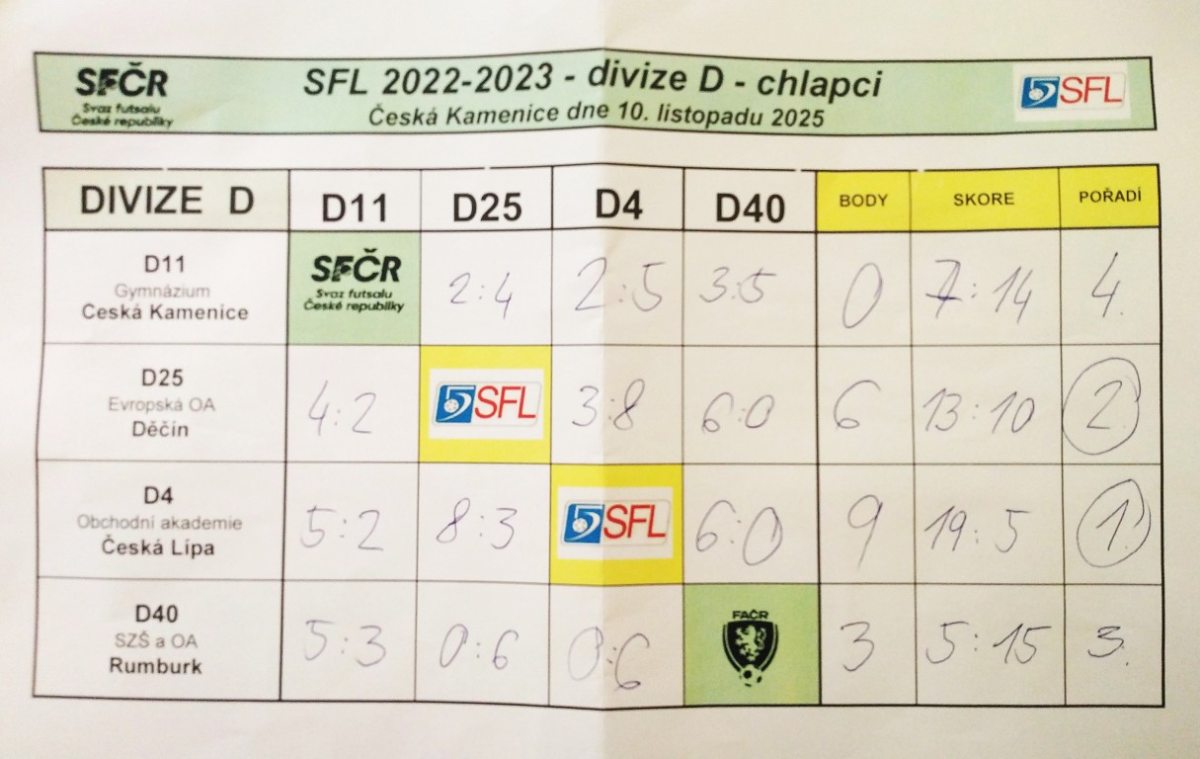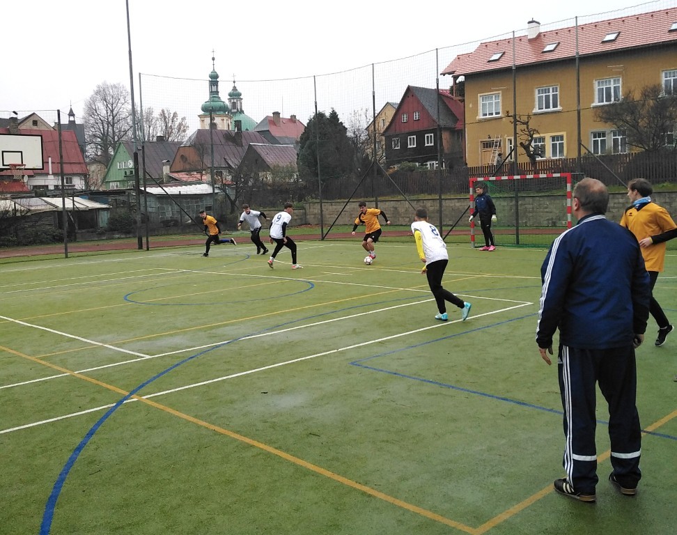 Dnes 10. listopadu proběhlo v České Kamenici 1. kolo Středoškolské futsalové ligy. Naši hráči si celý turnaj podmanili, když postupně porazili Gymnázium Česká Kamenice 5:2, Obchodní akademii Rumburk 6:0 a Evropskou Obchodní akademii Děčín 8:3. Zaslouženě tak postoupili z 1. místa do druhého kola, které proběhne v Ústí nad Labem. Naši školu reprezentovali: Jakub Lacina, Lukáš Jandáč, Matyáš Bobelák, Denis Heřmánek, Šimon Matys, Filip Hrňa, Jan Drlík, Miroslav Šešina, Petr Slovák, Dennis Nečas, Štěpán Zeman a Adam Hovbel. Gratulujeme!