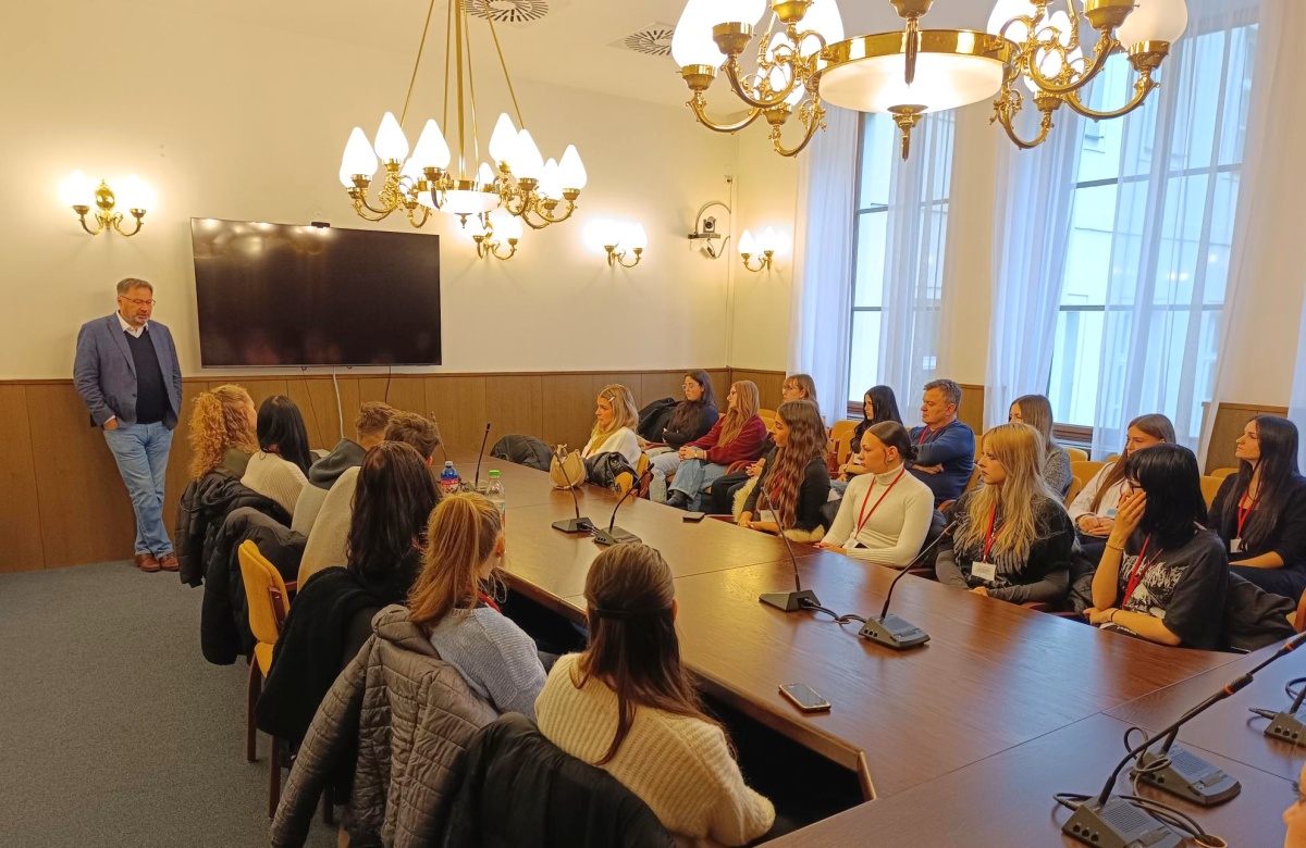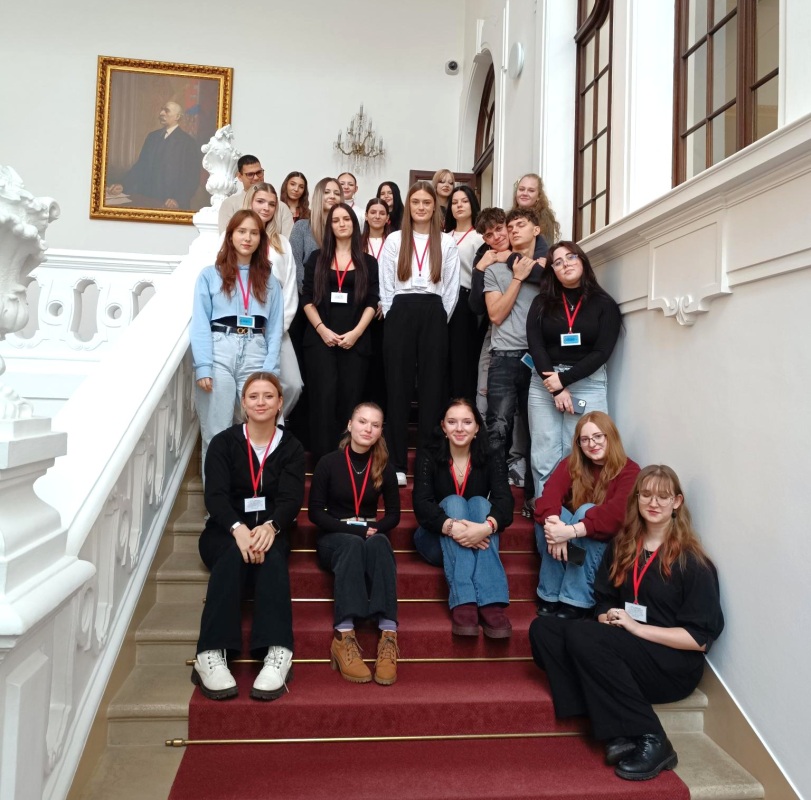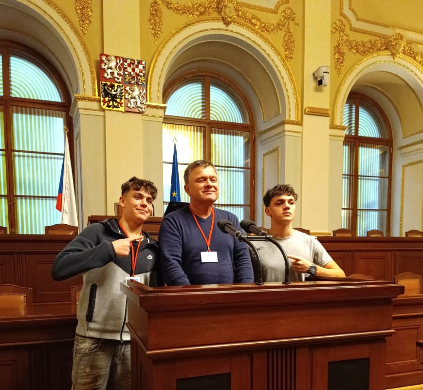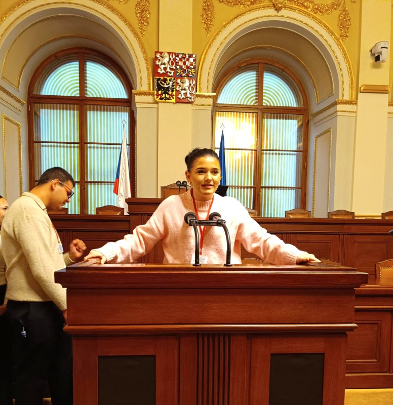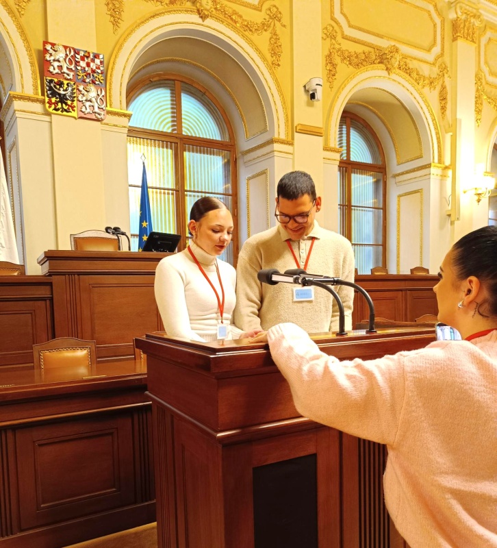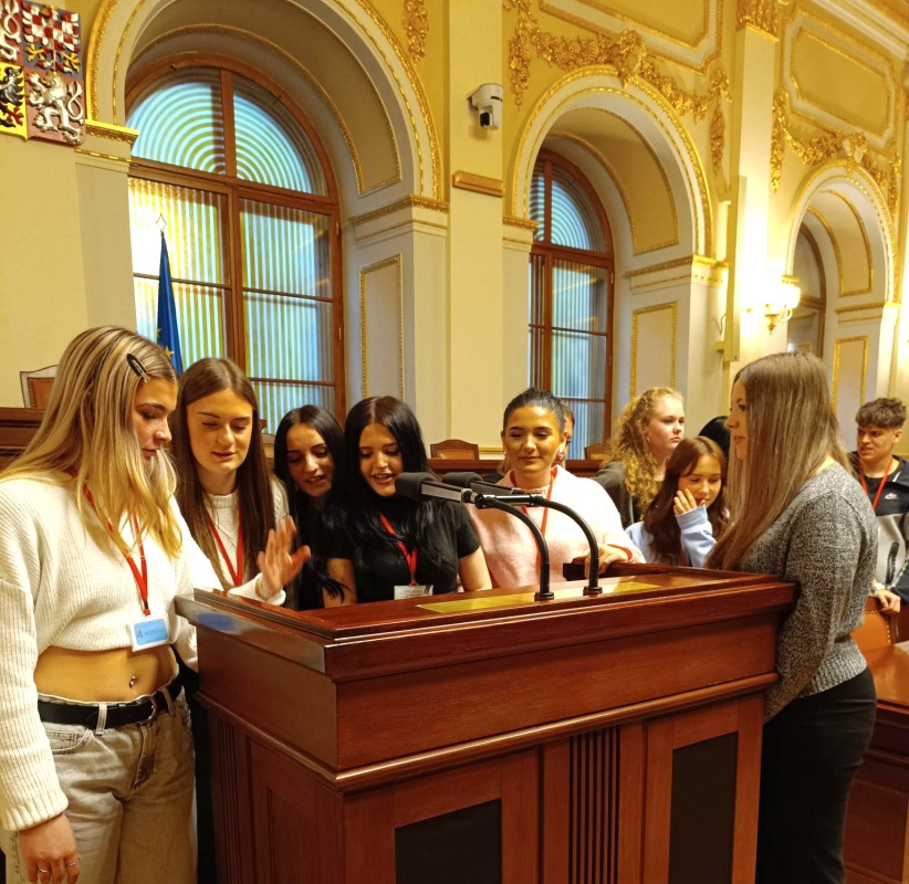 Společně jsme se poté přesunuli do jednacího sálu, kde si studenti mohli vyzkoušet proslov za řečnickým pultem – zážitek, na který se jen tak nezapomíná! Celá prohlídka byla zajímavá, poučná a inspirativní.