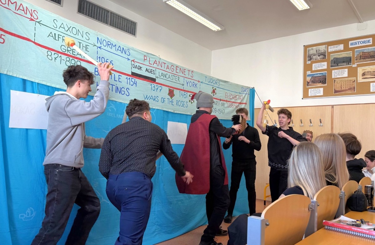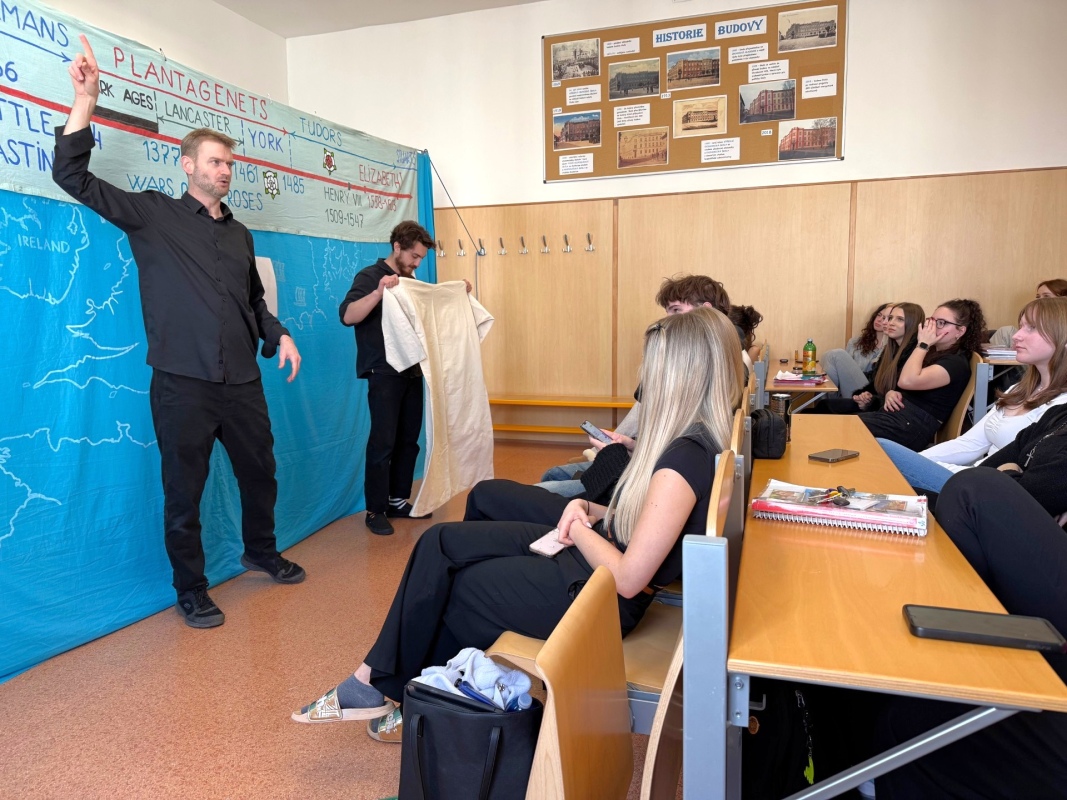 Vybrané třídy prvního, druhého a třetího ročníku se 3. března 2026 zúčastnily představení v anglickém jazyce vzdělávacího divadla The Bear Educational Theatre, které za námi přijelo z Prahy. Žáci prvních ročníků měli možnost shlédnout a aktivně se účastnit představení „London’s Burning“, zatímco žáci druhých a třetích ročníků se zapojili do představení „The History of England, Part 1“. Vtipně a interaktivně pojatá témata z historie Anglie přispěla k rozšíření povědomí studentů o anglických reáliích a vtáhla je do děje dané doby.