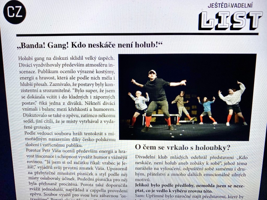 JeštěDyvadlo je čtyřdenní mezinárodní česko – polský festival dětského a mládežnického divadla, který propojuje divadelní soubory z obou stran hranice. Divadelní klub mladých se v prostorách Naivního divadla prezentoval polskou divadelní inscenací KDO NESKÁČE, NENÍ HOLUB ANEB…, která má za sebou už čtrnáct repríz z loňského roku. Představení bylo přijato velmi pozitivně nadšeným publikem, emotivní napojení jeviště a hlediště posunovalo průběh představení do finále a ovlivnilo elán a energii aktérů. Za což patří oběma stranám dík. Celá akce byla připravena ze strany organizátorů velmi pečlivě a program byl bohatý; různé hrací prostory – Naivní divadlo, Malé divadlo, Linserka, workshopy, průvod Libercem a diskuzní večery, koncerty…