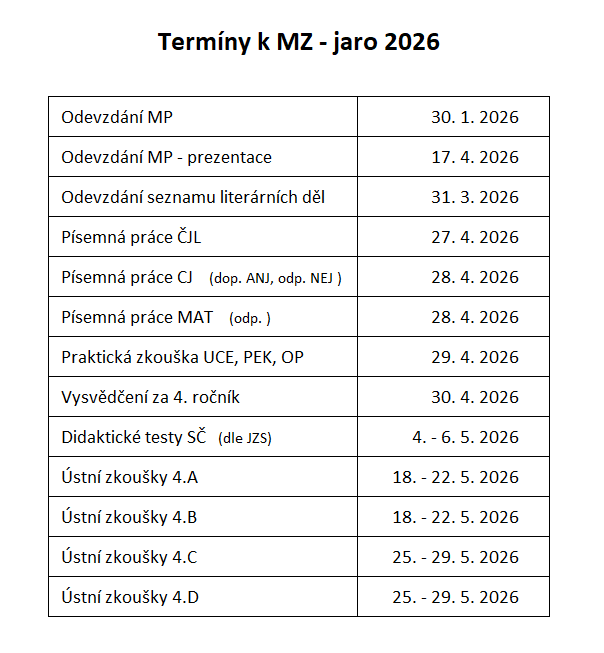 Informace o maturitních zkouškách najdete na stránkách CERMATu. Odkaz + Jednotné zkušební schéma Jaro 2026 zde.